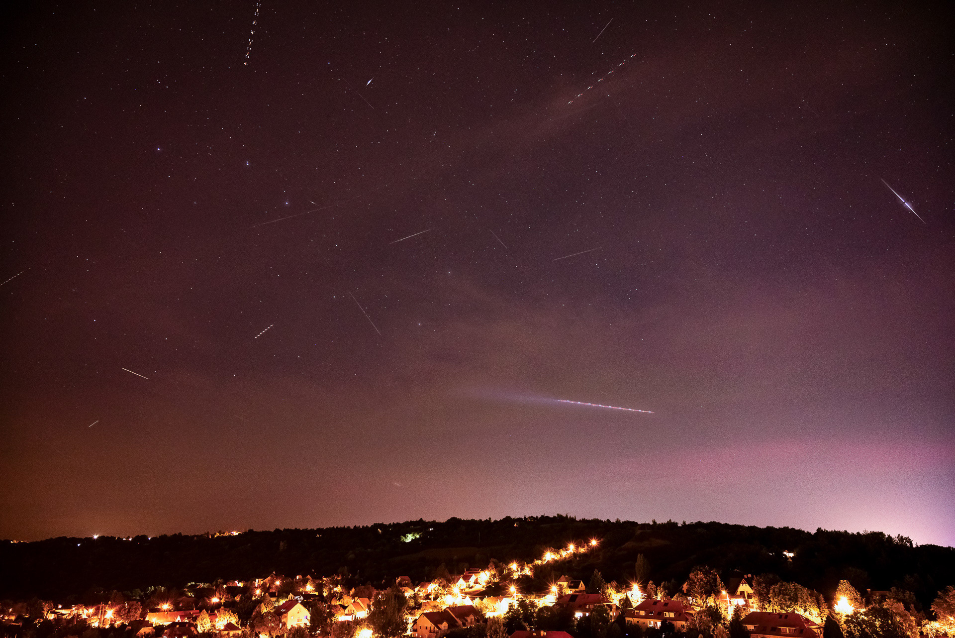The Perseids meteor shower spiced with aurora borealis, accompanied by the shining constellation Ursa Major, on a cloudy, busy city night.